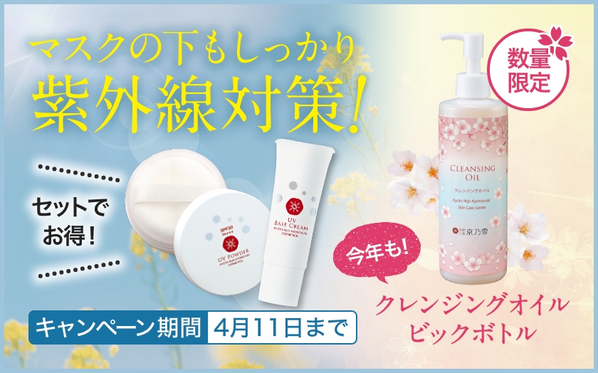 京乃雪のUVケアは27種類の和漢植物エキス配合で、肌にやさしくしっとりした使い心地。長時間つけてもお肌の乾燥を感じません。今なら2点セットで10%OFF!この機会にぜひ、紫外線からお肌を守るお手入れを始めましょう!